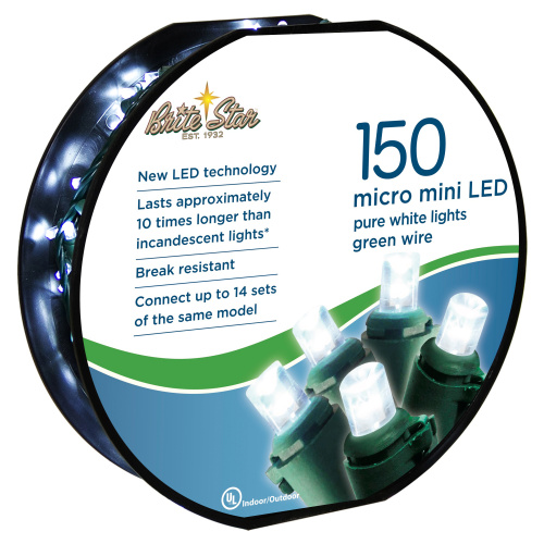 150 Lt MICRO MINI LED LIGHT SET ON REEL, PURE WHITE, GREEN WIRE, 4" x 4"SP x 4", TOTAL LENGTH APPROX 50.25 FT, MAX CONNECT: 14 SETS, SET WATTAGE: 14.4W, UL LISTED, INDOOR/OUTDOOR